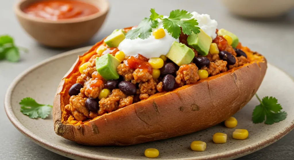 - Layer each potato with the ground turkey mixture, black beans, corn, diced avocado, a dollop of Greek yogurt, and a sprinkle of cilantro.